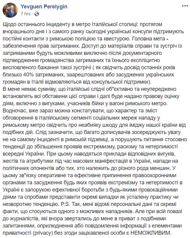 Украинские дипломаты активно поддерживают контакты с римской полицией, заявил посол Украины в Италии Евгений Перелыгин на своей странице в Facebook. Он сказал, что его главная цель - обеспечение прав предполагаемых расистов.
