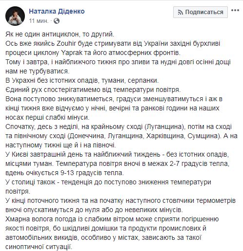 "В Украине без существенных осадков, туманы, дымки. Единственное движение будем наблюдать от температуры воздуха. Она постепенно будет снижаться, градусы будут уменьшаться и в конце недели уже почувствуем в ночные, вечерние и утренние часы на наших носах первые слабые минусы", - пишет Диденко.