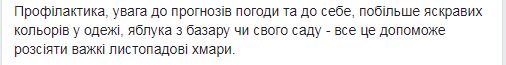 "Облачная влажная погода со слабым ветром может способствовать ухудшению качества воздуха, потому что вредные примеси и продукты промышленных и автомобильных выбросов, особенно в городах, зависают при такой синоптической ситуации. Профилактика, внимание к прогнозам погоды и к себе, побольше ярких цветов в одежде, яблоки с базара или своего сада - все это поможет рассеять тяжелые ноябрьские тучи", резюмирует Диденко.