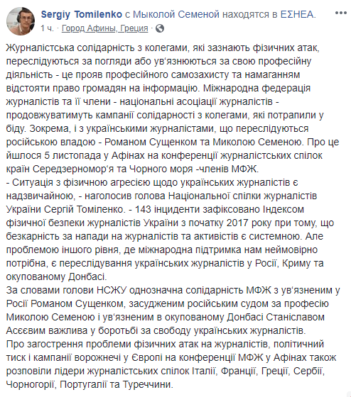 По словам председателя НСЖУ однозначная солидарность МФЖ с заключенным в России Романом Сущенко, осужденным российским судом за профессию Николай Семена и заключенным в неподконтрольном Донбассе Станиславом Асеевым важна в борьбе за свободу украинских журналистов.