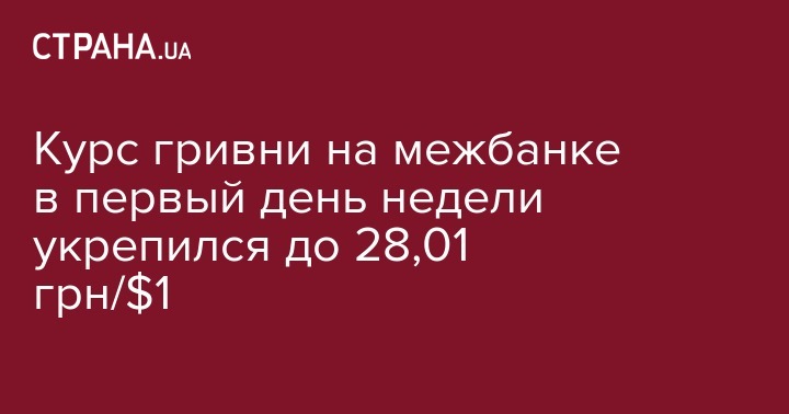 Курс гривни на межбанковском валютном рынке в понедельник укрепился до 28,01 грн/$1 с 28,095 грн/$1 днем ранее, сообщили агентству "Интерфакс-Украина" дилеры коммерческих банков.