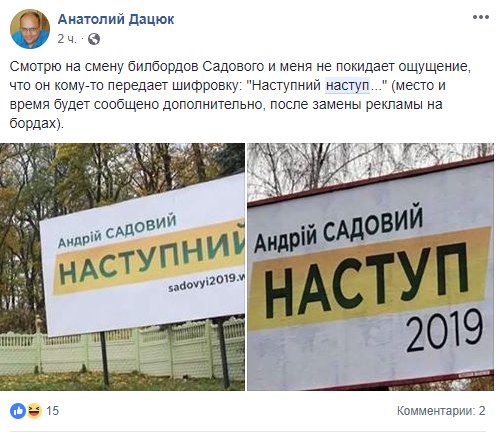 Как видим, видоизмененный "Наступний" удобен в использовании на ситилайтах: "Андрей Садовый. НАСТУП 2019". Всего три буквы убрали, а смысл уже другой.