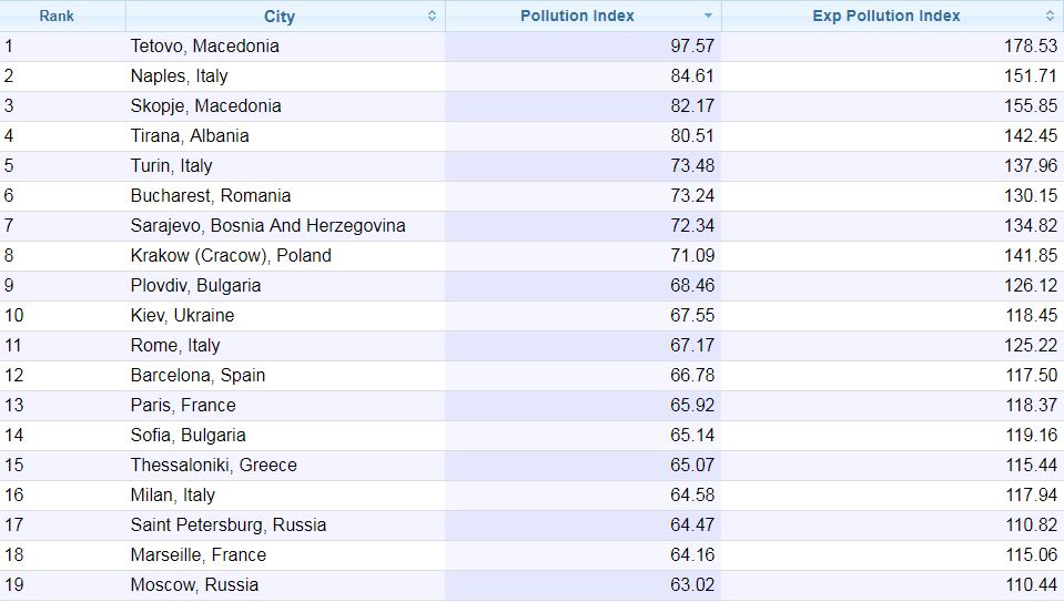 Также в топ-10 вошли албанская столица Тирана, итальянский Турин, румынский Бухарест, столица Боснии и Герцеговины Сараево, польский Краков, а также Пловдив (Болгария). Российский Санкт-Петербург занял 17-е место, обогнав Москву по уровню загрязнения на две позиции.