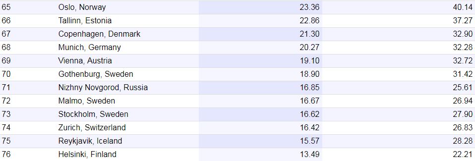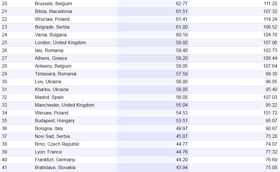 В рейтинг также попали два украинских города - Львов (58,08 пунктов) на 30 месте и Харьков (56,05) на 31 месте.