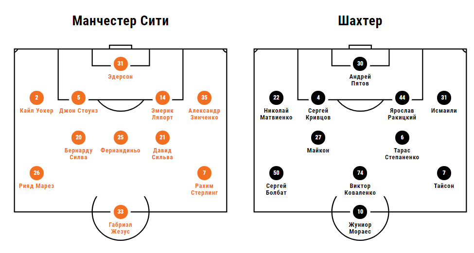 Манчестер Сити: Эдерсон, защитники: Уокер, Стоунс, Лапорт, Зинченко, полузащитники: Фернандиньо, Д.Сильва (к), Б.Силва, нападающие: Стерлинг, Марез, Жезус