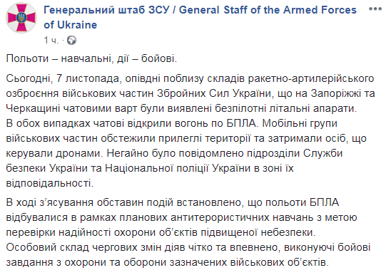 Их выявили в Запорожской и Черкасской областях. Охрана складов открыла огонь по БПЛА и задержала лиц, которые их запустили. Все произошедшее оказалось учениями, говорится на странице Генштаба ВСУ в Facebook.