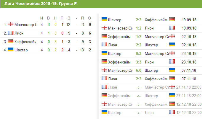 Лига чемпионов, положение команд в группе F и график оставшихся матчей