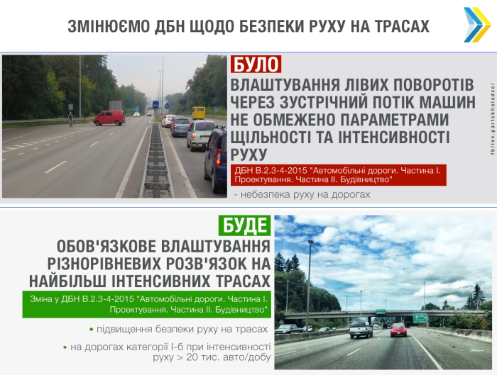 "В новых изменениях в ДСН относительно автомобильных дорог общего пользования планируем ограничить обустройство левых поворотов на участках с высокой интенсивностью движения и предусмотреть в этих местах обязательное проектирование разноуровневых развязок", - заявил заместитель министра регионального развития Лев Парцхаладзе.