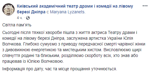 "Глубоко скорбим по поводу преждевременной смерти очаровательной женщины с удивительной энергетикой и творческим талантом. Высказываем искреннее сочувствие семье и близким, разделяем скорбь всех, кто знал и работал с Юлией Волчковой", - говорится в сообщении.