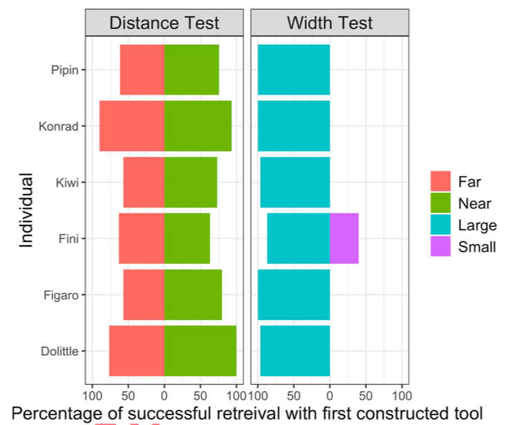 Все птицы успешно справились с заданием, в котором угощение нужно было достать с помощью либо короткой, либо длинной палочки, более чем в 50 процентах случаев, что выше шанса (и, соответственно, считается успешным). Также все птицы успешно справились с дырками большого диаметра, но только одна (самка по имени Фини) смогла смастерить достаточно тонкую палочку, чтобы проникнуть в узкую дырку (хотя и менее, чем в половине случаев).