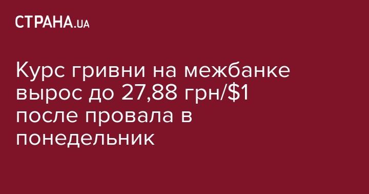 Курс гривни на межбанковском валютном рынке во вторник укрепился до 27,88 грн/$1 с 27,9125 грн/$1 днем ранее, сообщили агентству "Интерфакс-Украина" дилеры коммерческих банков.
