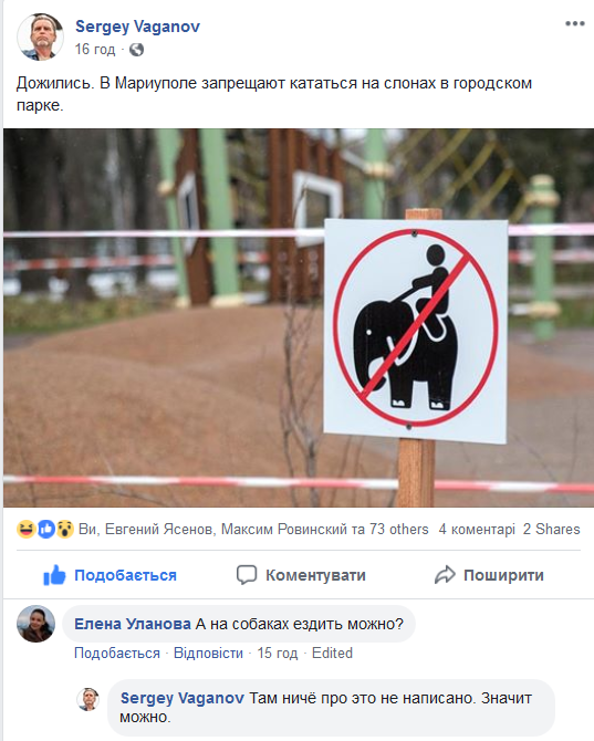 "Дожились. В Мариуполе запрещают кататься на слонах в городском парке", - написал Сергей Ваганов. В комментариях к посту развернулась ироничная дискуссия. Так, пользователи задаются, вопросом, а можно ли кататься, например, на собачьх упряжках.