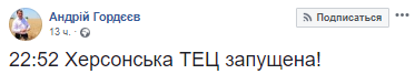 "22:52 Херсонская ТЭЦ запущена!" - написал Гордеев.