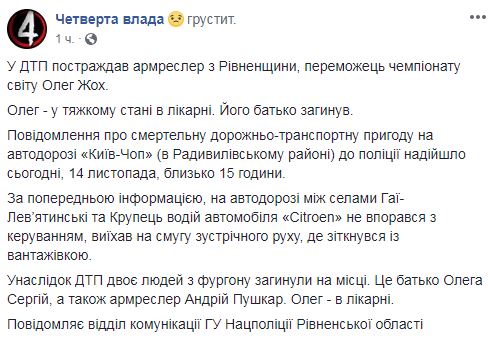 "Известно, что на автодороге между селами Гаи-Левятинские и Крупец 26-летний житель Острожского района, известный украинский спортсмен, по предварительной информации, водитель автомобиля Citroen, не справился с управлением, выехал на полосу встречного движения, где столкнулся с грузовиком под управлением 30-летнего жителя Черновицкой области", - говорится в сообщении.