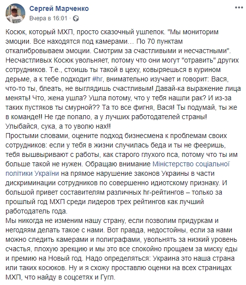 Эксперт в сфере труда Сергей Марченко возмущен такими методами: "Косюк, который МХП, просто сказочный ушлепок. "Мы мониторим эмоции. Все находятся под камерами… По 70 пунктам откалибровываем эмоции. Смотрим за счастливыми и несчастными". Несчастливых Косюк увольняет, потому что они могут "отравить" других сотрудников. Т.е., стоишь ты такой в цеху, ковыряешься в курином дерьме, а к тебе подходит #hr, внимательно изучает и говорит: Вася, что-то ты, бл**ть, не выглядишь счастливым! Давай-ка выражение лица менять! Что, жена ушла? Ушла потому, что у тебя нашли рак? И из-за таких пустяков ты смурной?? Та то все фигня, Вася! Ты подумай, ты же в команде!! Не где попало, а у лучших работодателей страны! Улыбайся, сука, а то уволю нах!!