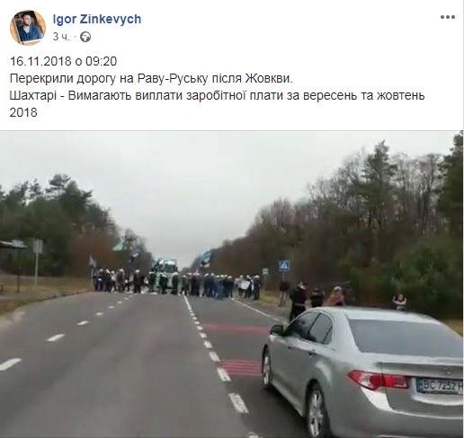 По его словам, дорога перекрыта за Жолквой. Депутат отметил, что шахтеры требуют выплатить зарплаты за сентябрь и октябрь 2018 года. Среди участников протеста - около 40 человек. Они без перерыва ходят по пешеходному переходу, чтобы блокировать транспорт.
