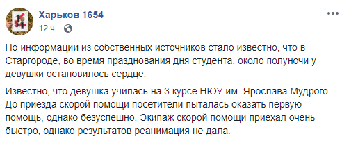 Установлено, что студентке третьего курса НЮУ им. Ярослава Мудрого стало плохо около 23 часов вечера 17 ноября.