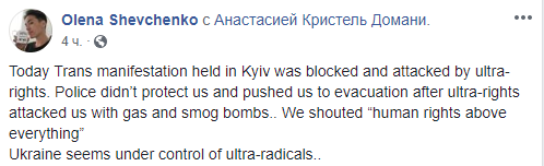 "Сегодня манифестация, проведенная в Киеве, была заблокирована из-за нападения ультраправых. Полиция не защитила нас и подтолкнула нас к эвакуации после того, как ультраправые напали на нас газовыми баллончиками и шашками. Мы скандировали "Права человека выше всего". Украина, похоже, находится под контролем ультрарадикалов".