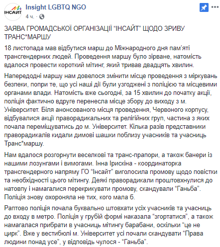 "Полиция разогнала Транс марш, загнав активистов в метро, и требовала спуститься вниз на станцию, хотя там были потенциальные нападавшие; а правые продолжили свою акцию "за традиционные ценности". Когда меня спросят, как в Украине с правами человека, я вспомню ситуацию, когда загнанные в метро и окруженные полицией активисты скандируют "Права человека превыше всего". Ужасно, что акция против ненависти было сорвана из-за ненависти. Это все, что нужно знать о толерантности и соблюдения права на мирные собрания".