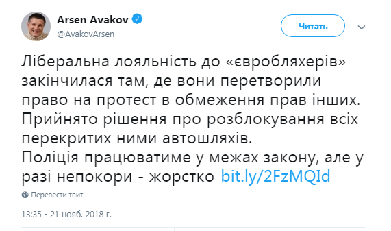 Ситуацию на своей странице в Twitter прокомментировал глава МВД Арсен Аваков. Он заявил ,что "евробляхеры" превратили право на протест в ограничение прав других. Также он проанонсировал жесткую реакцию полиции в случае неповиновения митингующих.