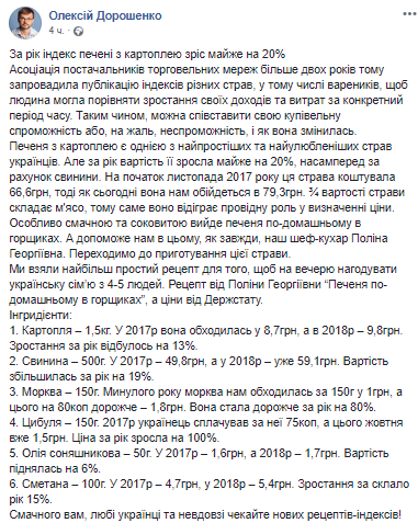 "На начало ноября 2017 это блюдо стоило 66,6 грн, тогда как сегодня она нам обойдется в 79,3 грн. ¾ стоимости блюда составляет мясо, поэтому именно оно играет ведущую роль в определении цены", - написал он.