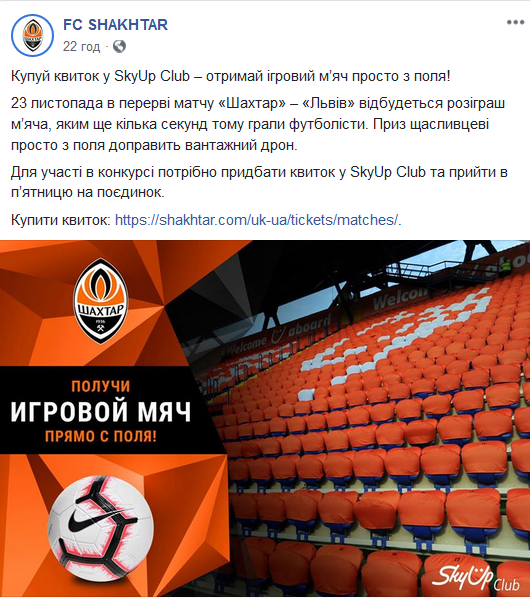"Купи билет в SkyUp Club - получи игровой мяч прямо с поля! 23 ноября в перерыве матча Шахтер - ФК Львов состоится розыгрыш мяча, которым еще несколько секунд назад играли футболисты. Приз счастливчику прямо с поля доставит грузовой дрон. Для участия в конкурсе нужно приобрести билет в SkyUp Club и прийти в пятницу на поединок", - сообщили в пресс-службе.