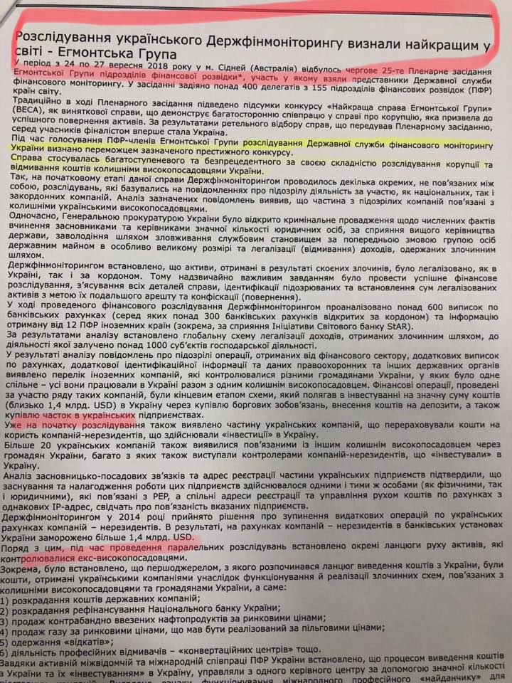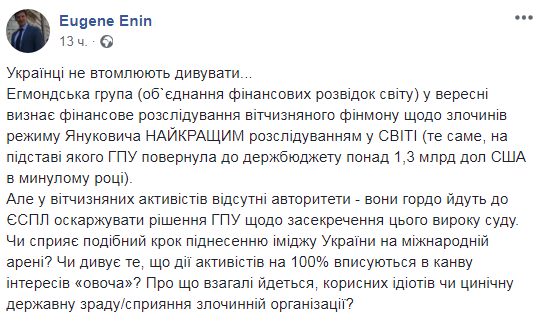 Поясняя свое недовольство Енин сообщил, что Эгмонтская группа (неформальное объединение подразделений финансовой разведки разных мира) в сентябре признала финансовое расследование Госфинмониторинга Украины о преступлениях времен Януковича лучшим в мире.