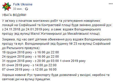 "Внимание водителям! В связи с началом монтажных работ и оборудования новогодних локаций на Софийской и Контрактовой площадях будет изменено дорожное движение с 24 ноября до 24 января 2019 года, а именно: вдоль Владимирского проезда (от улицы Малой Житомирской до Михайловской площади)", - предупредили организаторы.