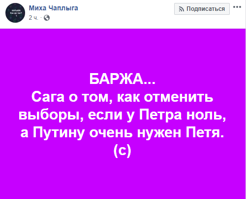 "Баржа... Сага о том, как отменить выборы, если у Петра ноль, а Путину очень нужен Петя. (с)", - написал политолог Михаил Чаплыга.