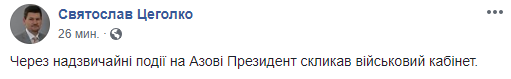 "Из-за чрезвычайных событий на Азове президент созвал военный кабинет", - написал он.