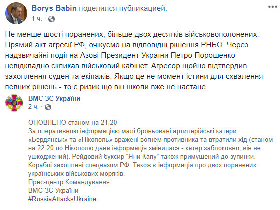 "Не менее шести раненых; более двух десятков военнопленных. Прямой акт агрессии РФ, ожидаем соответствующие решения СНБО. Агрессор только подтвердил захват судов и экипажей. Если это не момент истины для одобрения определенных решений - то есть риск что он никогда уже не наступит", - написал он в Facebook.
