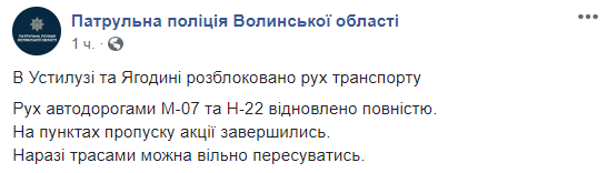 В патрульной полиции Волынской области заявили, что движение к пункту пропуску "Ягодин" разблокировано. "В "Устилуге" и "Ягодине" разблокировано движение транспорта. Движение по автодорогам М-07 и Н-22 восстановлено полностью. На пунктах пропуска акции завершились. Сейчас трассами можно свободно передвигаться", - говорится в сообщении, размещенном на сайте ведомства в Facebook.