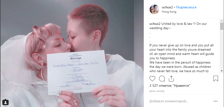 "... Если вы можете мечтать о любви, вы сможете ее найти. Любовь добра, она не осуждает. Любовь это и сила, и слабость. Любовь может изменить. Любовь побеждает!", - написала Этта У Чжолинь в подписи к фото со своей женой.