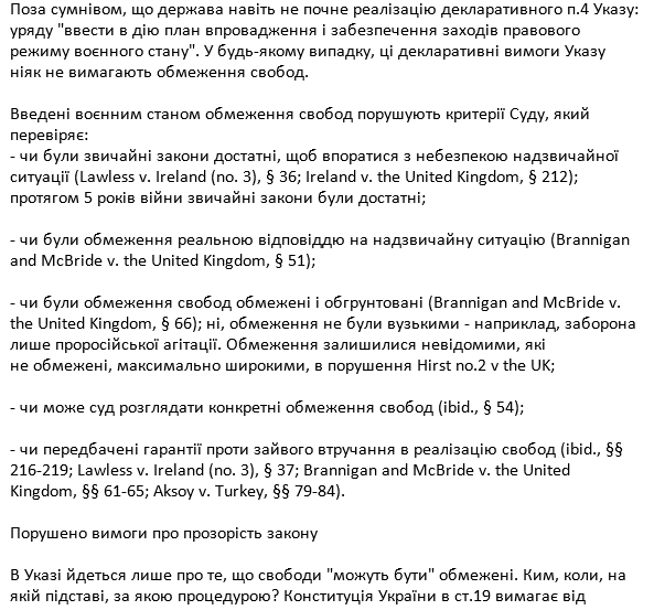Ранее международная неправительственная организация Freedom House также призвала украинскую власть обосновывать возможное ограничение конституционных прав граждан во время военного положения.