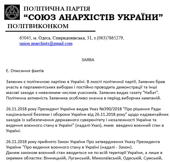 Одесские анархисты подали судебный иск в Европейский суд по правам человека (ЕСПЧ) после того, как  президент Петр Порошенко подписал указ о военном положении до 26 декабря, затрагивающем в частности Одесскую область.