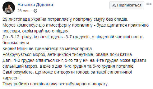 В четверг, 29 ноября, Украина попадает в воздушную полосу без осадков. Также во всех регионах кроме крайнего юга ожидается морозная погода -5...-12 градусов ночью и -3-7 С днем. В южной части Украины около нуля.