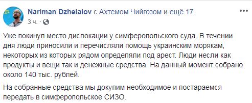 "Уже покинул место дислокации у симферопольского суда. В течение дня люди приносили и перечисляли помощь украинским морякам, некоторых из которых рядом определяли под арест. Люди несли как продукты и вещи, так и денежные средства. На данный момент собрано около 140 тыс. рублей (около 2 тысяч долларов - прим. ред.). На собранные средства мы докупим необходимое и постараемся передать в симферопольское СИЗО", - написал Джелялов.
