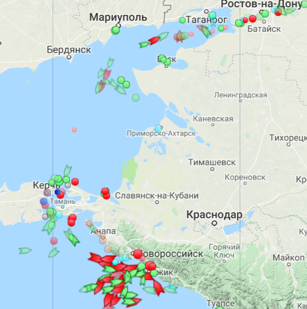 Особое внимание привлекает огромная корабельная "пробка" у входа в пролив и у порта Новороссийск. Не исключено, что там скопились и те корабли, которые ждут прохода к Украине.