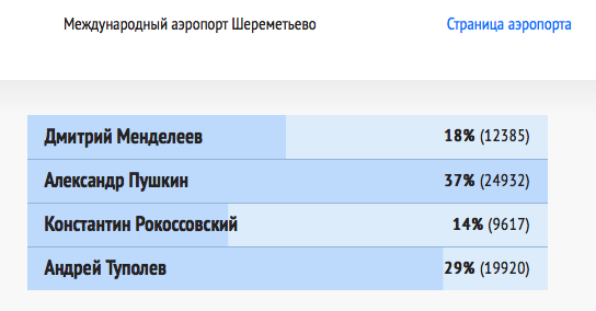 Шорт-листы для голосования формировались на основании вариантов, предложенных россиянами - в некоторых городах кандидаты дублируются. Поэтому Ломоносов победил и в его родном Архангельске, жители которого тоже хотят назвать его именем воздушную гавань.