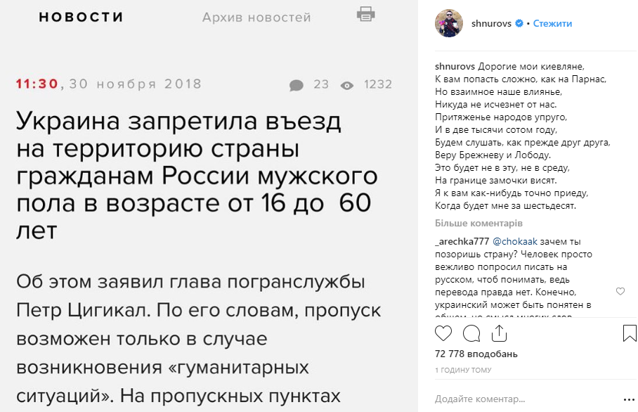 Лидер группы "Ленинград" Сергей Шнуров опубликовал в соцсети стихотворение, которое посвятил ограничению въезда россиян мужского пола и призывного возраста (16-60 лет) в Украину. Произведение музыкант разместил на своей странице в Instagram в пятницу, 30 ноября.