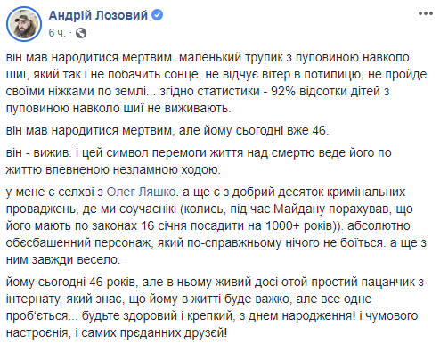 Тем временем, соратники Олега Ляшко упражняются в изощренных поздравлениях именинника в соцсетях. Так, народный депутат от Радикальной партии Андрей Лозовой поведал про рождение лидера фракции, рассказав подробности про младенца, обвитого пуповиной и "торжество жизни над смертью".