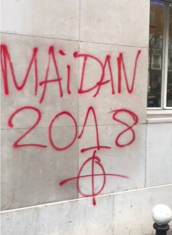 Однако этого почему-то не происходит. Украинские сторонники революции достоинства не спешат говорить теплые слова в адрес собратьев из Франции. А подчас начинают их критиковать. Даже несмотря на то, что на Триумфальной арке появилась надпись "Майдан 2018".