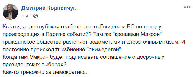 "Кстати, а где глубокая озабоченность Госдепа и ЕС по поводу происходящих в Париже событий? Там же "кровавый Макрон" гражданское общество разгоняет водометами и слезоточивым газом. И постоянно происходят избиение "онижедетей".