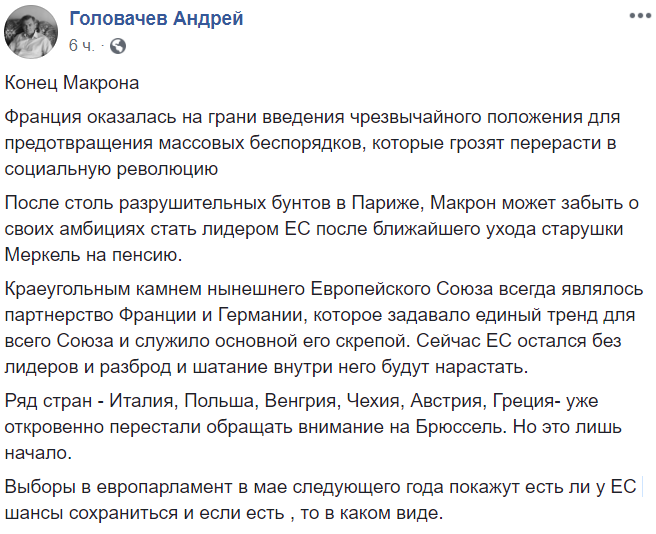 С ним согласен и блогер Андрей Головачев. Он считает, что происходящее в Париже - это "конец Макрона" и подрыв перспектив Франции на европейское доминирование.