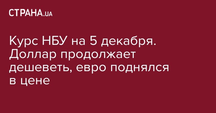 Так, согласно курсу НБУ на 5 декабря, официальный курс гривны к американскому доллару составил 28,12 грн/$. Между тем, евро заметно подорожал - на 16 копеек, до 32,08 грн/€.