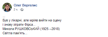 "[Рушковский] был в больнице, но мечтал выйти на сцену", - написал журналист. О причинах смерти актера пока не сообщается.