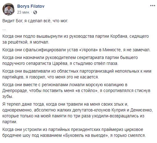 "Когда они подло вышвырнули из руководства партии Корбана, сидящего за решеткой, я молчал. Когда они сфальсифицировали устав "Укропа" в Минюсте, я не замечал. Когда они назначили руководителем секретариата партии бывшего подручного сепаратиста Царёва, я стыдливо отвел глаза. Когда они выдавливали из областных парторганизаций нелояльных к ним партийцев, я говорил, что меня это не касается. Когда они вместе с регионалами ломали мэрскую коалицию в Днепрораде, чтобы поставить меня "стойло", я сопротивлялся стиснув зубы", - напиал он.