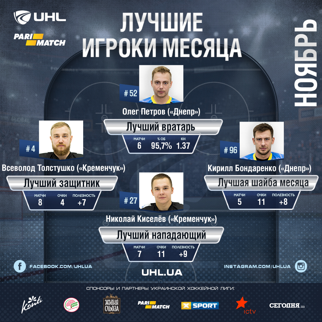 Лучшим вратарём ноября стал представитель херсонского "Днепра" Олег Петров. В 6 матчах он заработал коэффициент надёжности 1.37, пропустил всего 8 шайб и отбив 95,7% бросков. Две встречи из 6 стали "сухими" для вратаря "Днепра".