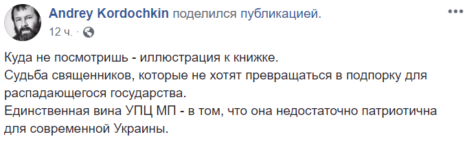 Единственная вина УПЦ МП - в том, что она недостаточно патриотична для современной Украины", - пишет в Facebook священник из Мадрида Александр Кордочкин.