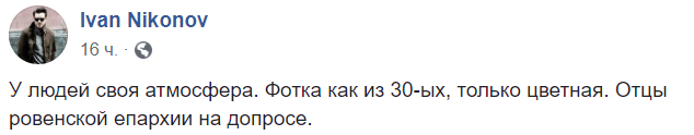 "У людей своя атмосфера. Фотка как из 30-ых, только цветная. Отцы ровенской епархии на допросе", - так звучит пост блогера Ивана Никонова.